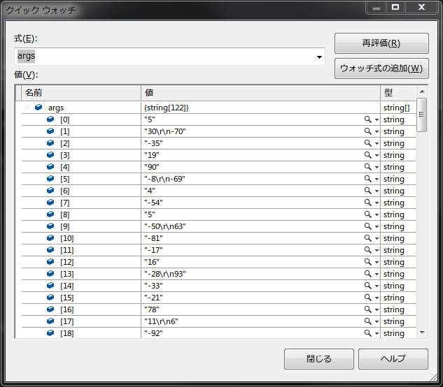 何が問題かというと、実際にクイックウォッチで引数の内容を見ると…